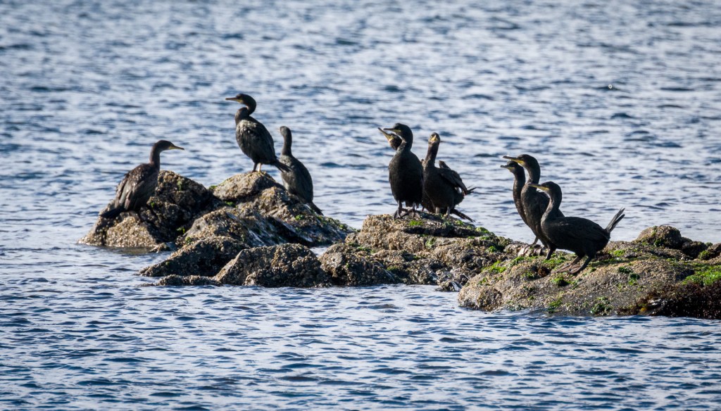 Yesterday, as well as the plovers, there was a ‘gulp’ of cormorants sitting out on the rocks, plus four harbour seals (three on the water and one on the rocks)