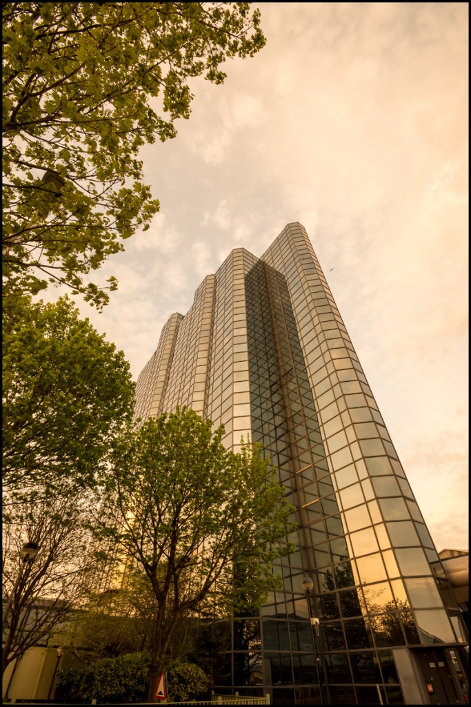 And finally, two ways to present an image – one full frame and the other a severe crop. These two images are of a riverside hotel in Glasgow, and I find it hard to believe that they are indeed presented from a single digital shot. The original colour is from a setting sun. The close-up is slightly desaturated for effect.