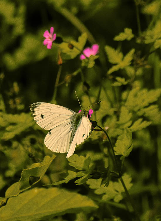 Here I offer some images of the Green-veined White butterfly. I came across these in a glade by the river where the two specimens were flitting about and supping from Herb Robert. I’ve presented standard nature shots of this species before but this time I’ve ventured into some subtle toning of the images. Maybe this is ‘shallow and frivolous’ but I feel happy with the way they turned out.