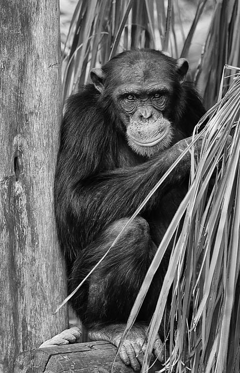 But then, of the monochrome images that I’ve taken recently, my own favourite is of that Chimpanzee at Edinburgh Zoo. This was good in colour but the bright green grasses at the right just took you eye away from the subject. So another reason to go into mono is to hide distracting colour.