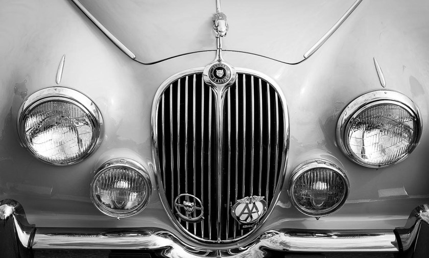 I find buildings often are improved as monochromatic images. For me, mono emphasises shapes and textures when colours might be distracting. The next one has little texture but plenty of form, and this old 60’s Jaguar works for me in mono too.