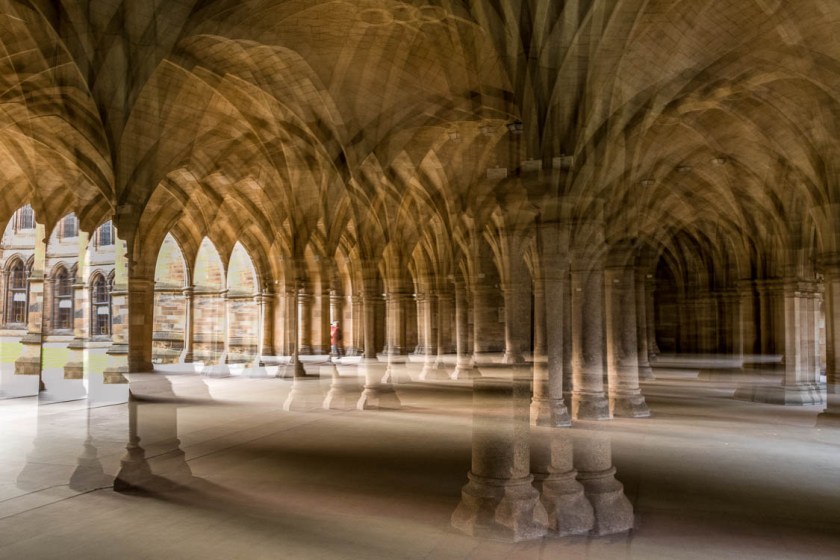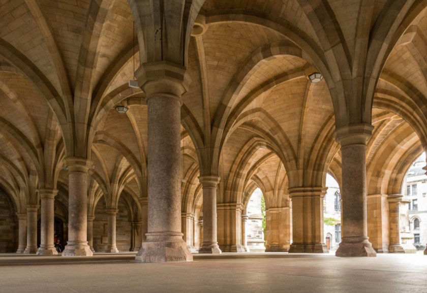 “The Cloisters (also known as The Undercroft) connect the East and West quadrangles and lead inside the Gilbert Scott Building to the stunning Bute Hall, where the University’s graduation ceremonies are held, and the Hunterian Museum. With their fluted columns and transverse ribbed vault, these impressive archways are an iconic part of the University, and have been seen onscreen in many films and TV shows including Cloud Atlas and Outlander.”