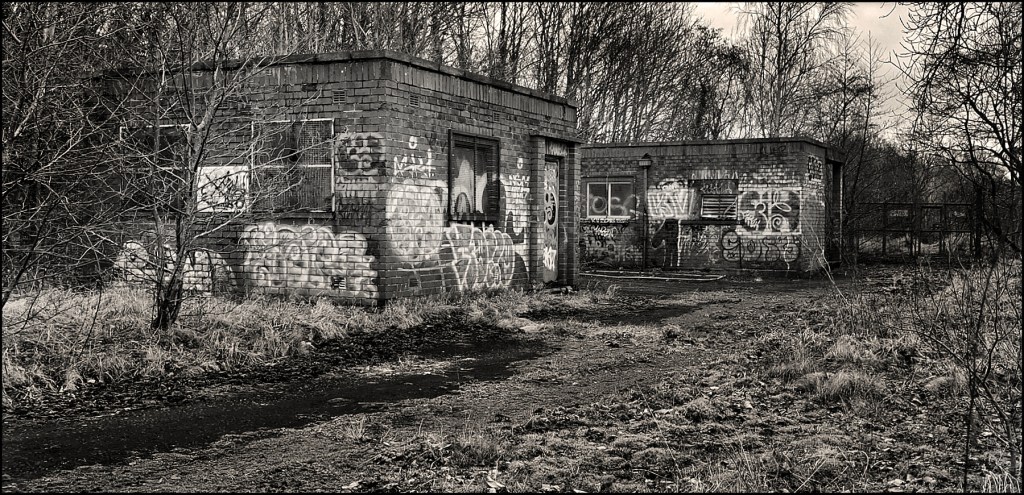 Old brickwork. Abandoned. Sodden ground. Overgrown. Over-painted