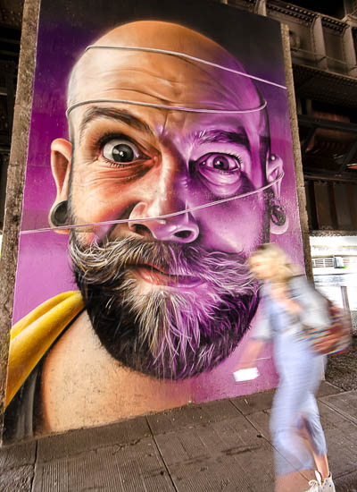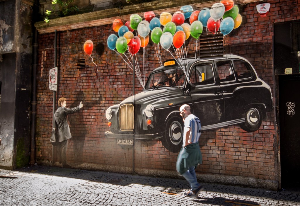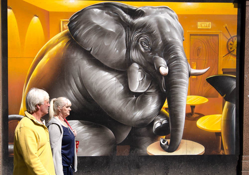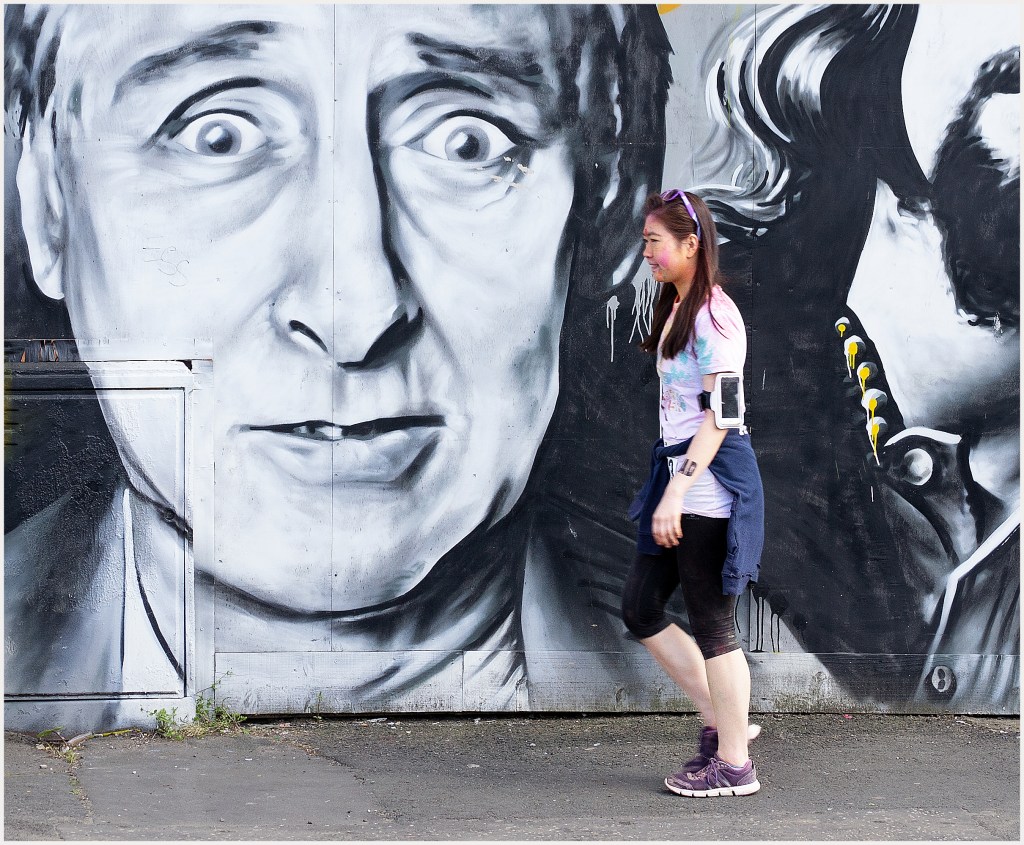 Scratching my head, I recalled a tour with some friends of Glasgow’s mural art. And my approach that day had been to show the art in juxtaposition to people – people walking by or the life going on around those paintings large and small.